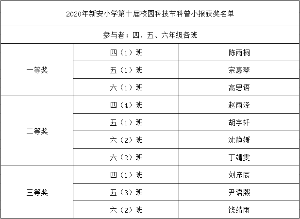为了培养学生的创新精神和实践能力,营造浓郁的科学氛围,激发学生从小爱科学、学科学、用科学的兴趣,新安小学于2020年11月9日-11月30日举办了以“快乐科技我能行”为主题的第十届校园科技节。本次活动学校领导高度重视,精心安排,科学、信息技术、美术教师积极努力,班主任认真实施,全体师生积极参与,取得了可喜的成绩。现将获奖情况通报如下: