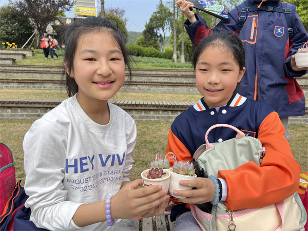 一进门,孩子们就被眼前五彩缤纷的郁金香吸引住了,不禁啧啧赞叹!在参观的过程中,孩子们看到了波光粼粼的湖面、项目众多的游乐场、宽阔的大草坪……各个主题花园美不胜收。接着同学们走进花房,开始DIY多肉植物。同学们拿起小铲子,在花盆填好土,用手把土压实,小心翼翼地将多肉放入花盆,用小石子撒在土上,一盆可爱的多肉终于种好了。他们将亲手制作的多肉盆栽带回教室,为此次与植物的相约留下美好的纪念。