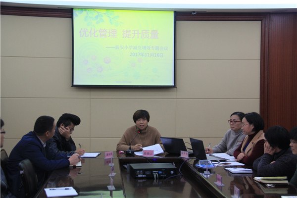 为贯彻落实常州市教育局“规范学校管理,切实减轻中小学生课业负担”的会议精神,11月16日下午,新安小学以“优化管理,提升质量”为准绳,紧扣“让每个孩子健康快乐成长”这一宗旨,召开 “减负增效”专题教学工作会,全体教师参加本次会议,会议由梁晓云校长主持。