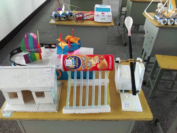 5月27日,是孩子们最期待的日子。因为今天他们制作的科技作品要评奖并且要进行为期三天的展出。你看,孩子们一吃过午饭就迫不及待地来到三楼多媒体教室,欣赏他们的作品啦!“看,这台小电扇真不错,风还挺大的!”“你们快来瞧,这艘轮船能在水中开。哇!还是遥控船。”孩子们看着琳琅满目的科技作品,惊叫连连。