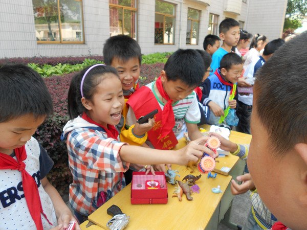 第二节课下课铃声刚响起,同学们就迫不及待地拿着早已准备好的物品,来到各自班级的摆摊地点,摆上几张课桌,布置好简易小摊,开始了他们的兜售活动。原本寂静的校园一下子沸腾起来,人山人海,热闹非凡。孩子们一个个兴高采烈,各班的推销员们各有各的特色,你看:他们有的蹬着椅子,手举几样毛绒玩具,在空中来回舞动,脸涨得通红,卖力地大声叫喊着;有的手里捧着货物“走街串巷”,向大伙儿推荐着自己的物品;还有的拉着老师,热心地向他们介绍着货物的用途……小会计们也不甘落后,有条不紊地记录着每一样东西所卖的钱,还不时地帮着销售。六年级的同学更是有着商人般精明的头脑,他们在操场上一圈一圈地搜索着,看中目标就走上去推销自己的商品,在他们的游说下,他们的物品总能卖出好价钱。大家忙来忙去,可真是不亦乐乎。